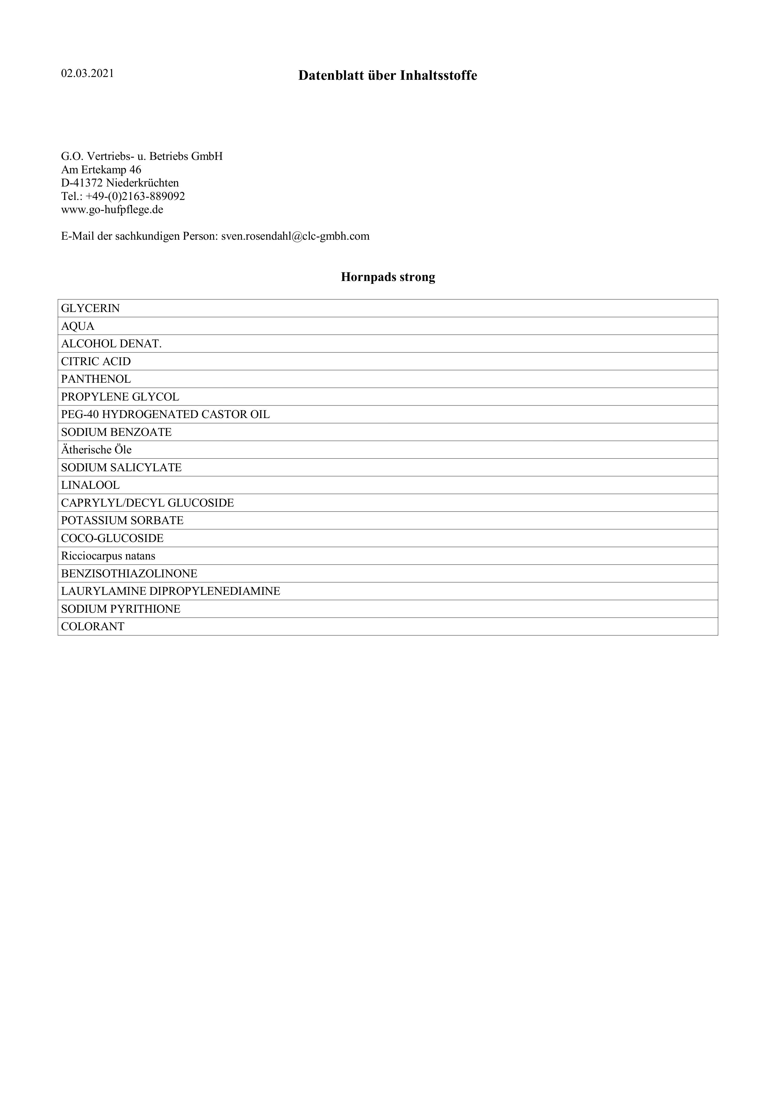 Die Hornpads Strong enthalten unter anderem Linalylacetat (LINALYL ACETATE) und Linalool (LINALOOL). Diese Inhaltsstoffe können in seltenen Fällen allergische Reaktionen hervorrufen, weshalb eine sorgfältige Anwendung empfohlen wird.